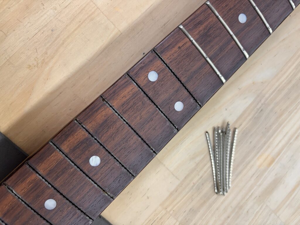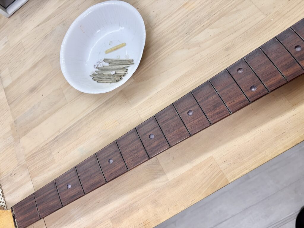 フレット溝は側面にだけ白のプラスチックを入れ、上面は茶色い木材で埋めます。ポジションマークもローズウッドで。
