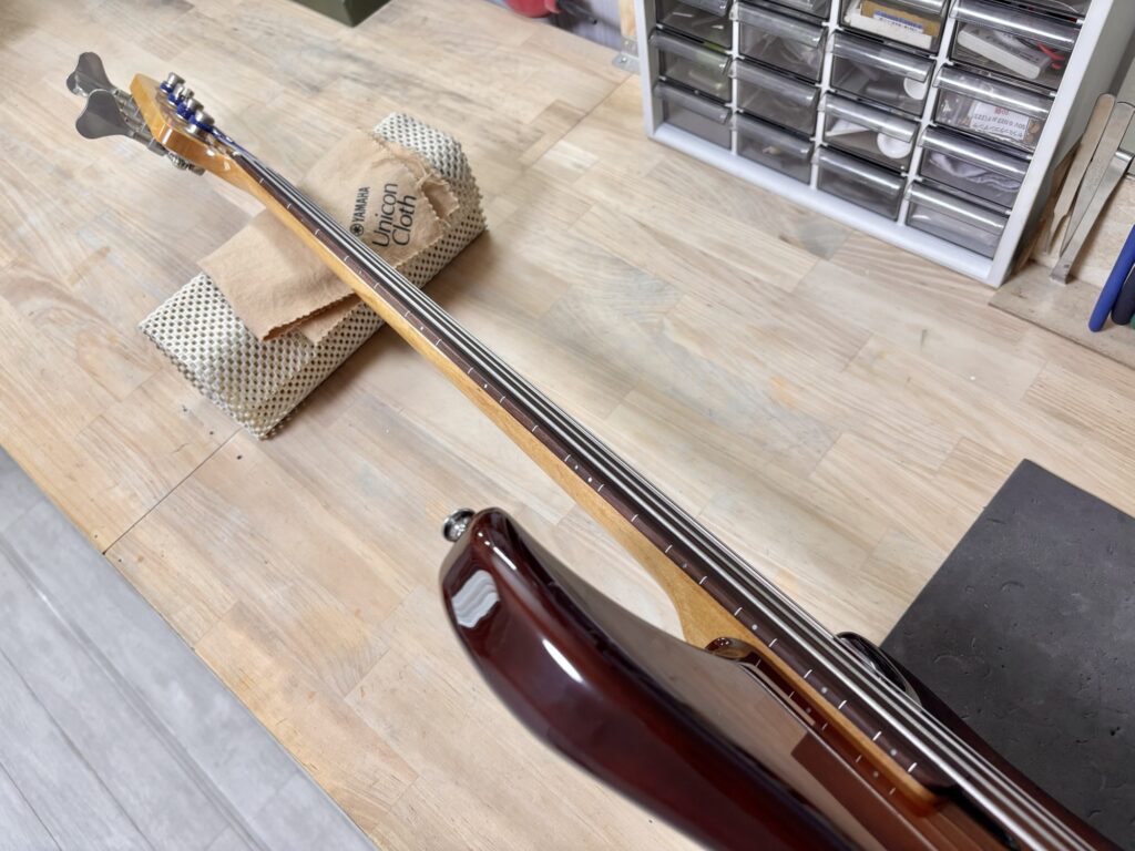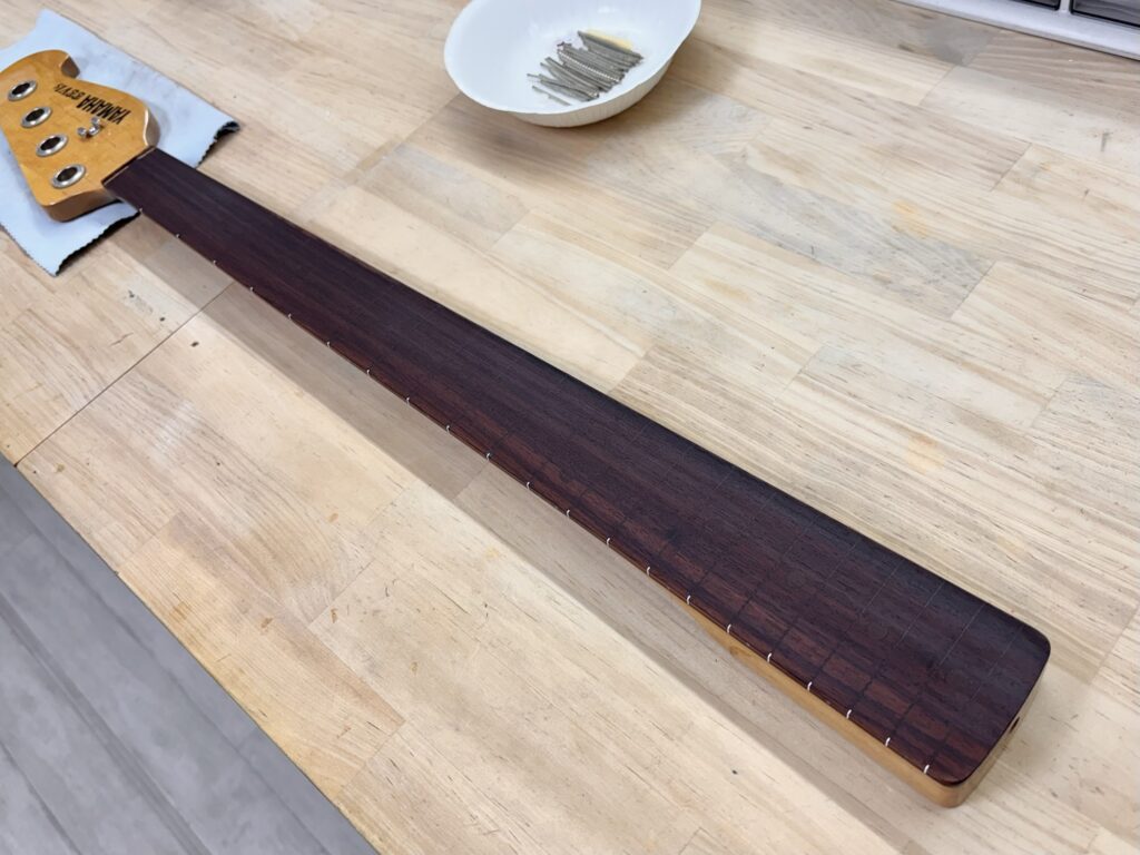 製品の時点で側面にだけラインが入っているフレットレスもあるはありますが、数としては少数派です。今回のようにフレッテッドをフレットレス化して側面にだけハッキリ見えるラインを入れるというのは、演奏しやすいライン無し(風)フレットレスを手に入れるための有効な手段のひとつと言えるでしょう。