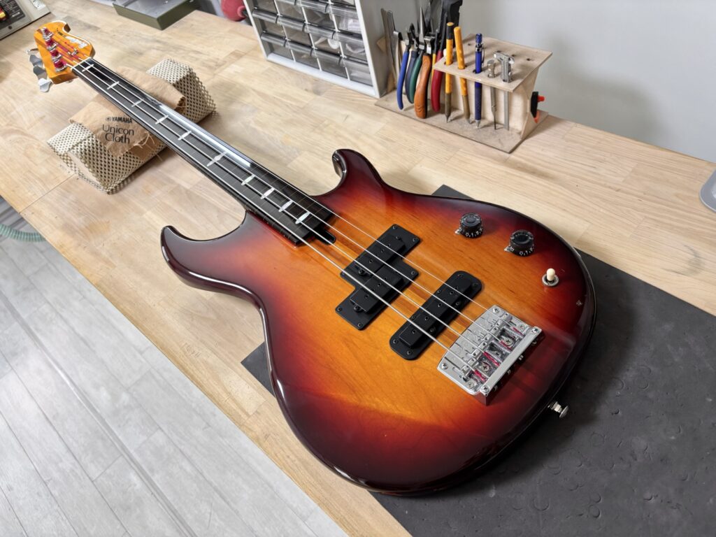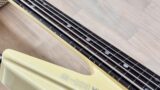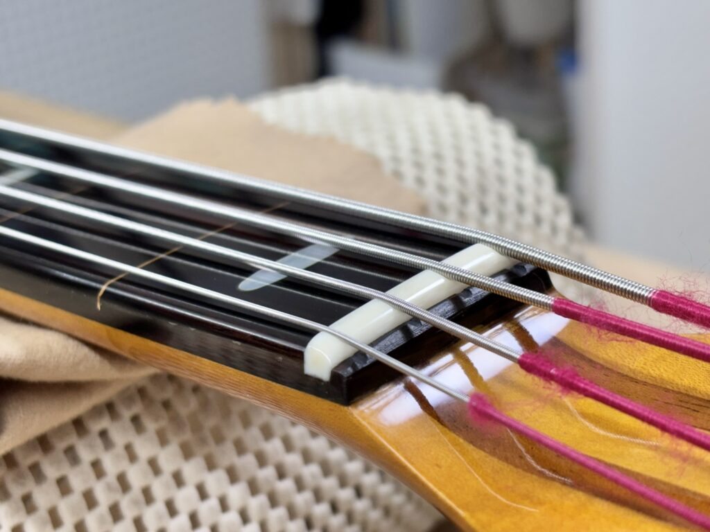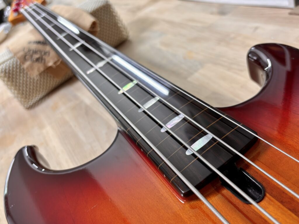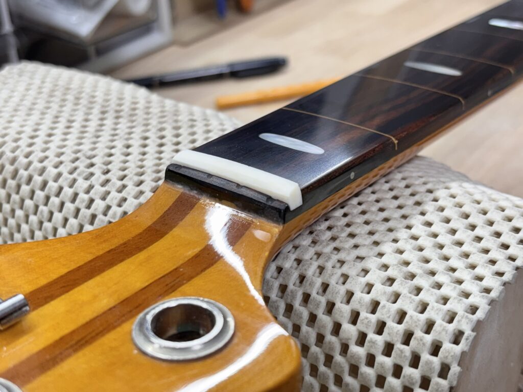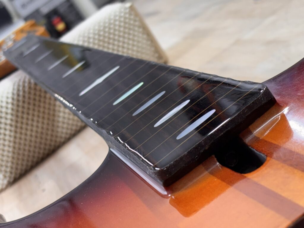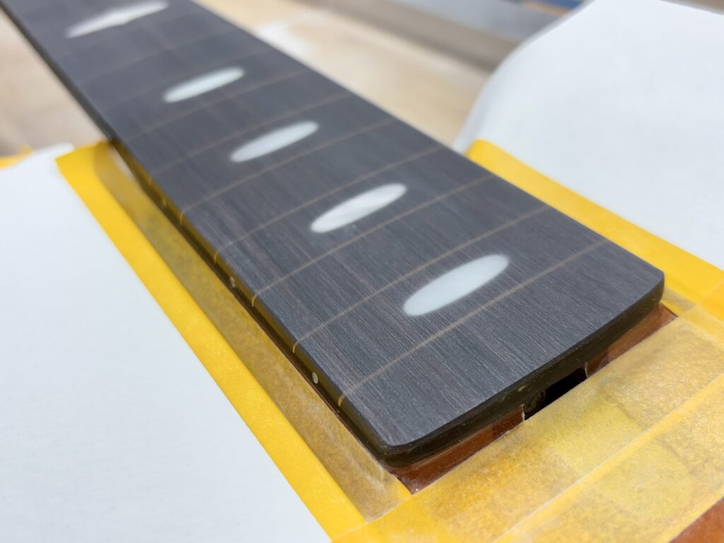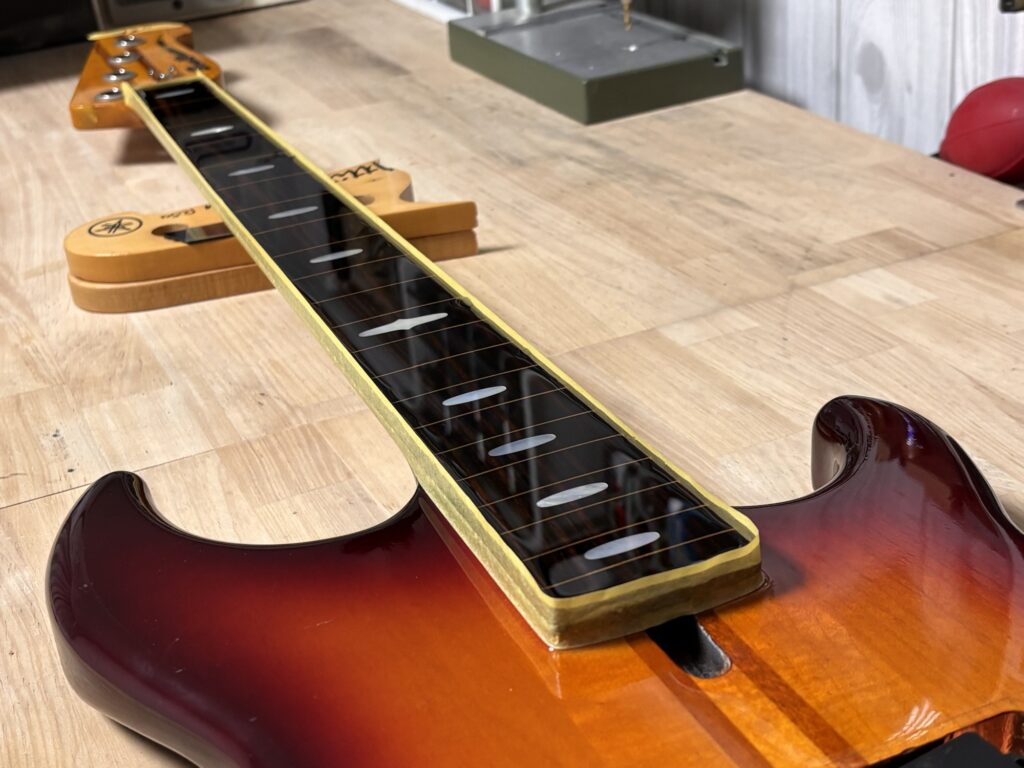 エポキシコーティング フレットレス化 X Facebook はてブ LINE コピー 2025.09.04 指板をマステで囲み、エポキシを流し込みます。 硬化を待った後、削っていきます。 土台の指板のRと同じRになるように削ります。 ナットも新しくします。 完成しました。