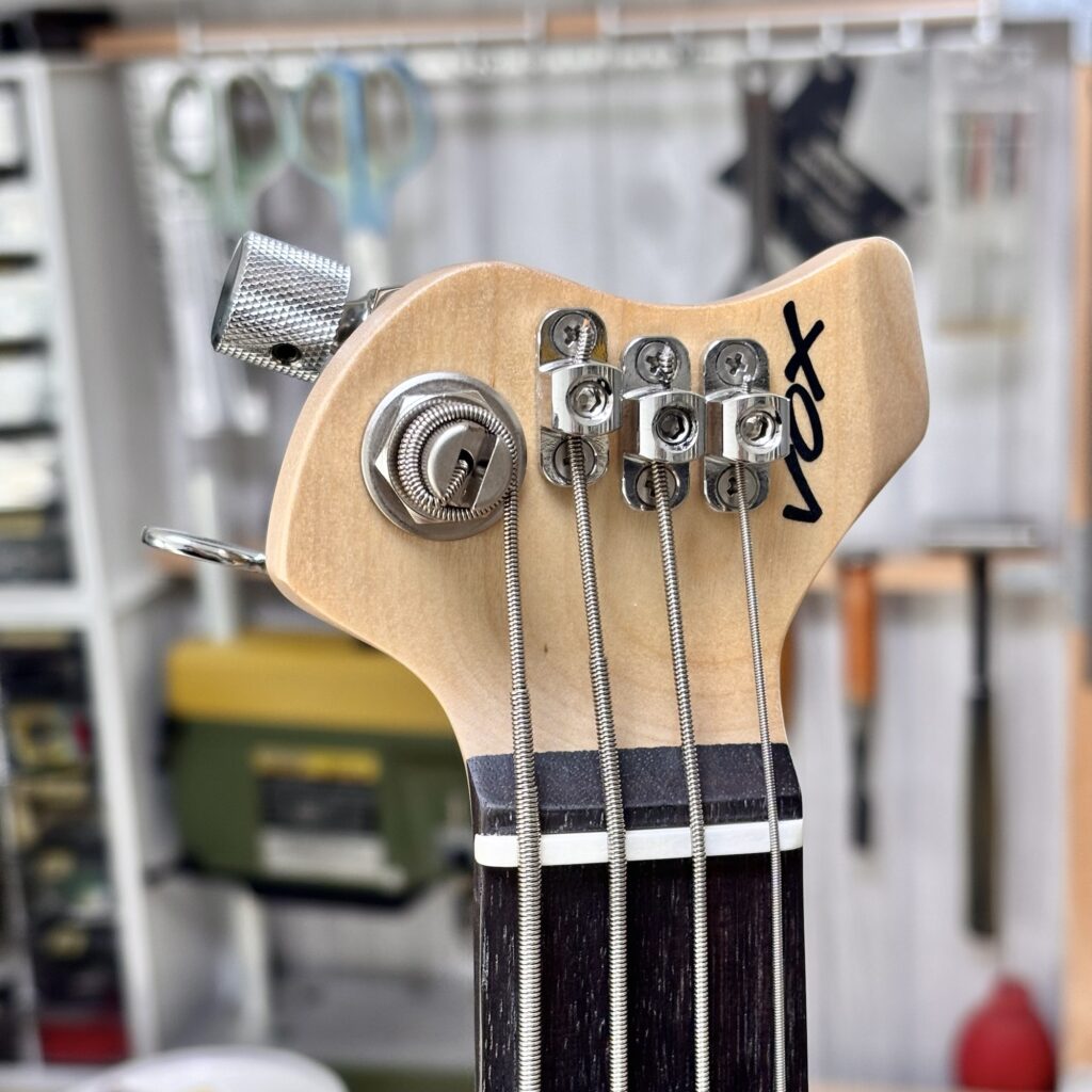 ヘッドはE弦にエクステンダーキー、A〜G弦はEgilegor Bassesのヘッドピースで保持。