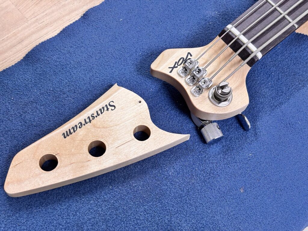 ブリッジはNova Guitar Parts製を取り付けました。ボディフレームの形状のおかげで大きな加工は不要でした。またストラップピンも最初からヘッドレスブリッジを取り付けるうえで大変都合が良い位置にあります。